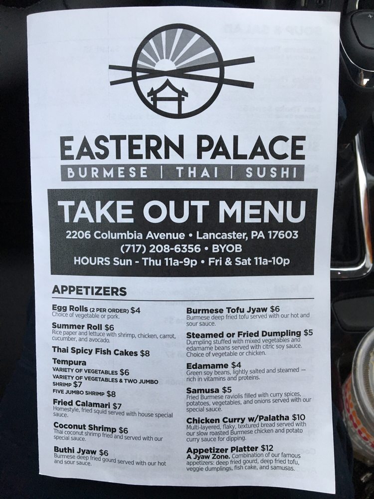 Introducing Eastern Palace, a Thai - Sushi Bars brand located in Lancaster, PA. This restaurant offers a wide range of options including vegan and vegetarian choices, alcohol, and happy hour specials. Customers rave about the friendly owner and fresh, delicious dishes. Reviews mention standout items like Beef Curry, fried banana dessert, steamed pork dumplings, Chicken Pad Thai, mango fried rice, mango sticky rice, and Keh Se kehy with shrimp. The menu boasts tantalizing creations such as Egg Rolls, Tom Yum Soup, Tea Leaf Rice Salad, and Burmese curry. Diners praise the restaurant's cleanliness, excellent service, and familial atmosphere. Experience the homemade, authentic flavors at Eastern Palace for a memorable dining experience.